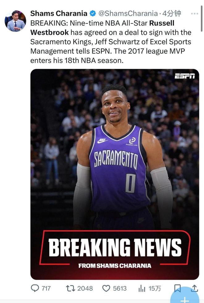 昨天深夜名记Shams的报道:九届NBA全明星拉塞尔威斯布鲁克已经同意加盟国王,这位2017年的MVP即将开启生涯第18个赛季。