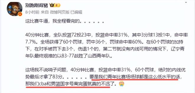 媒体人别跑刚背猪,对辽宁队的表现进行了锐评,他先是对获得60罚球有些暗讽:“这比赛牛逼,我全程看完的”,然后他对未来中国篮球表示了担忧,他说,40分钟比赛,投篮命中率31%,60个罚球,绝对的内线优势最后才拿了83分。。。。。。要是我们青年比赛场场球都是这么低水平的话,那我们cba和男篮国字号离完蛋就真的不远了。