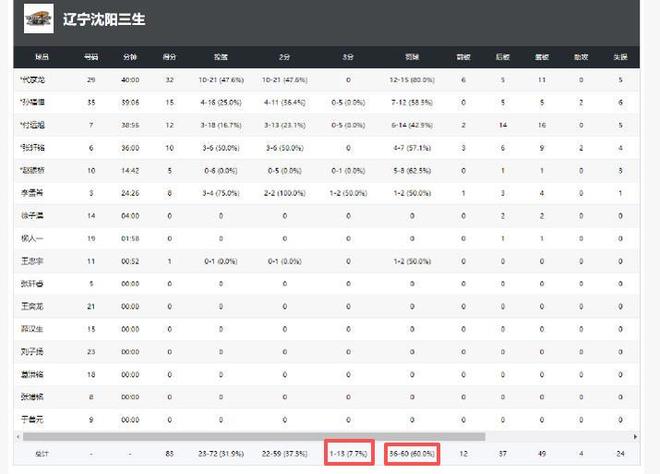 辽宁队员的技术太粗了,60次罚球才得36分,命中率只有60%,三分全场13投,只中1中,命中率7.7%,投篮球命中率31%,这样的命中率真是超低,也可以说是低得离谱,也许这就是目前辽宁男篮的缩影,怪不得这次全运会辽宁男篮全线覆灭,颗粒无收,连铁牌也拿不到。值得一提的是,尽管辽宁队获得60次罚球,却只是赢了山西队6分,这表现也够难看的了。